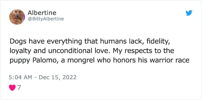 “Dogs have everything that people lack: loyalty, devotion and unconditional love. My respects to Palomo the dog, the mongrel who worthy of his warrior race."