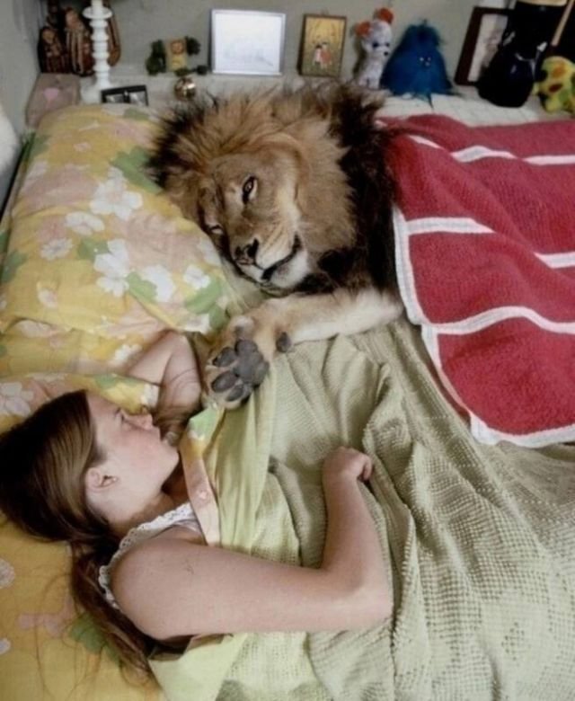 14-year-old Melanie Griffith at home with her beloved lion Neal, 1971