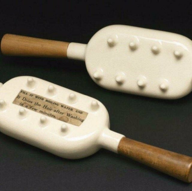 This is what a hair dryer looked like in the 1880s. Hot water was poured into it and hair was combed.