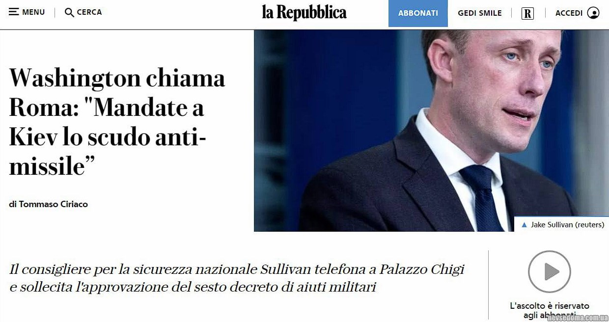 - The United States is putting pressure on Italy to supply Ukraine with military air defense systems as soon as possible, — La Repubblica.