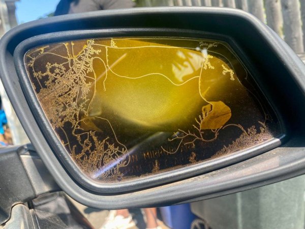 Broken glass of the side mirror, in the cracks of which water got into and froze