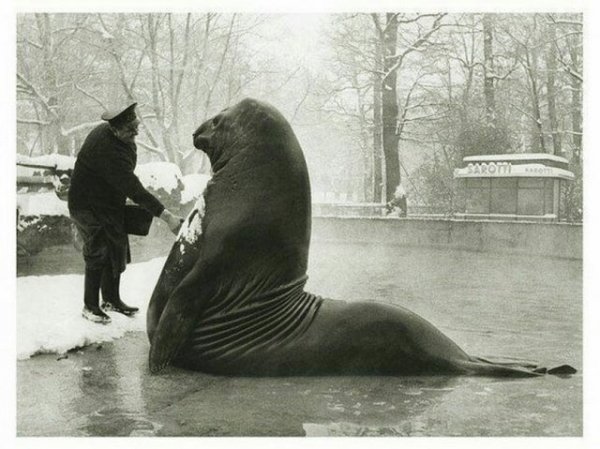 Sea lion Roland taking a snow bath, 1930 By the way, Roland was a well-fed sea lion. Its weight was almost 2 tons.