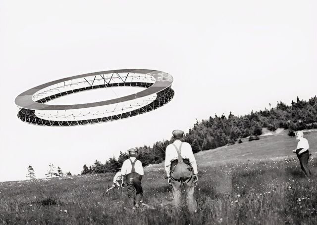 Scientist Alexander Graham Bell and his assistants testing a kite with tetrahedral panels, 1903