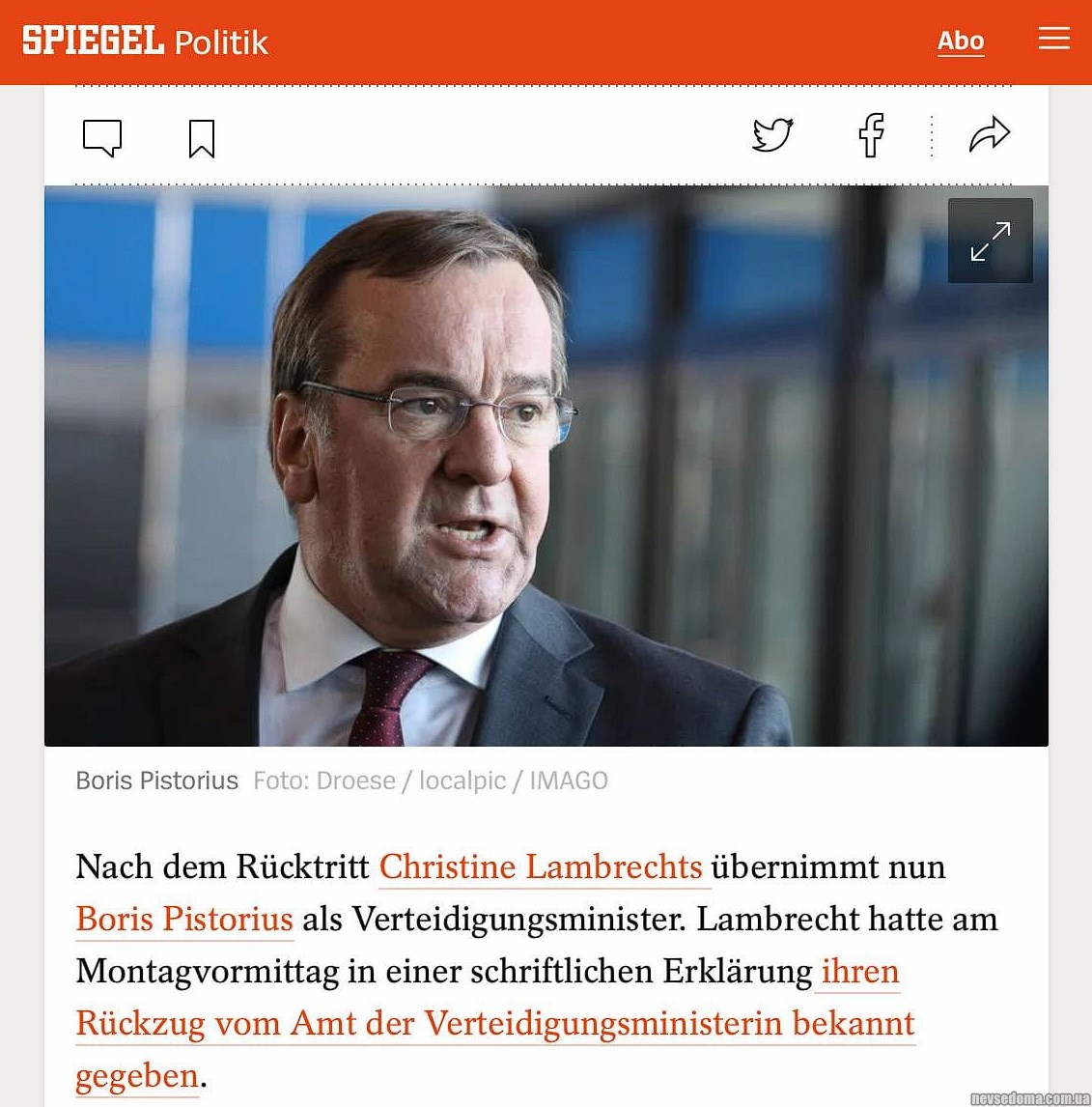 - Boris Pistorius will become the new Minister of Defense of Germany, — Spiegel