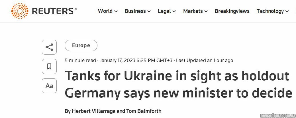 - It is quite possible that the new head of the German Ministry of Defense will send Leopard 2 tanks to Ukraine, — Reuters (https://www.reuters.com/world/europe/ukraine-demands-speedier-weapons-deliveries-west-confront-russian-pressure-2023-01-17/).