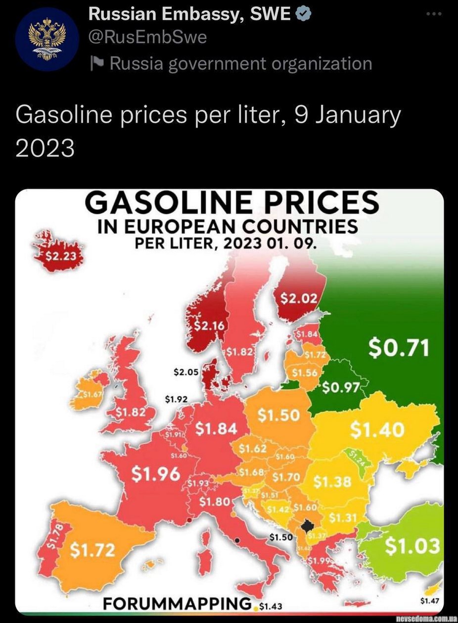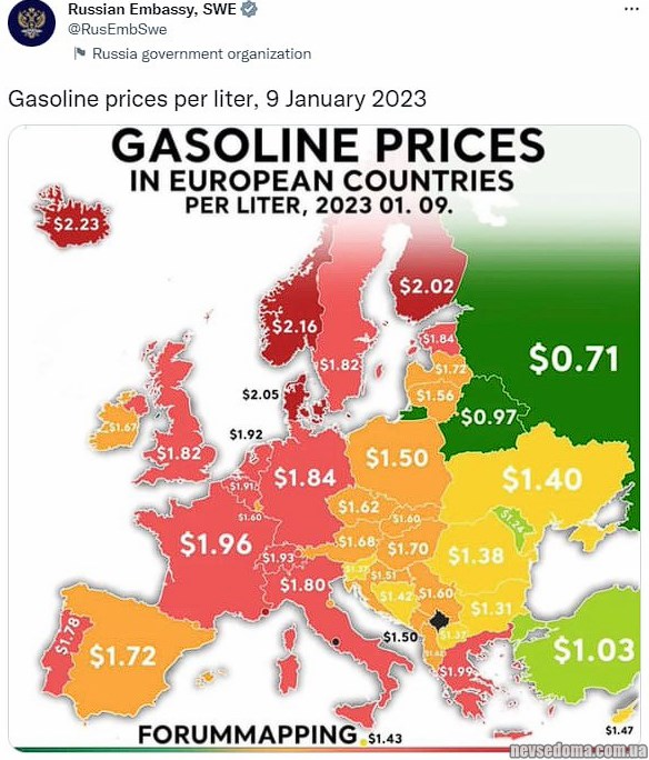 Diplomats-propagandists decided to compare fuel prices in Europe and Russia, and rolled out a color map with our Crimea.