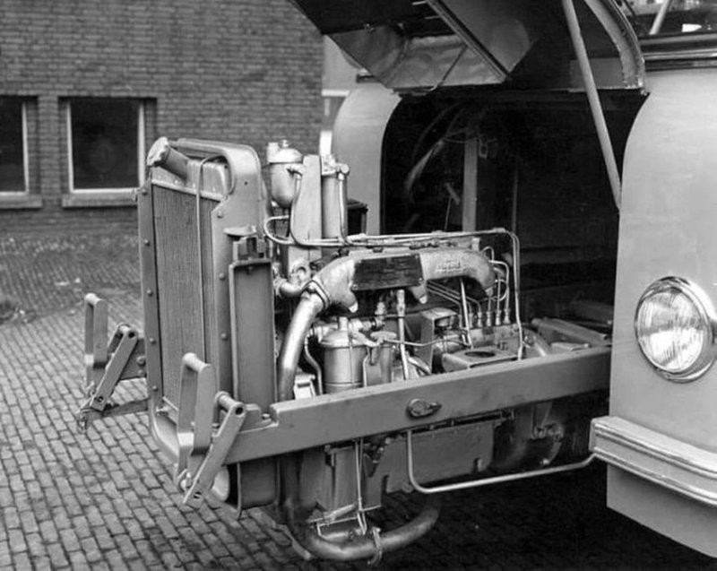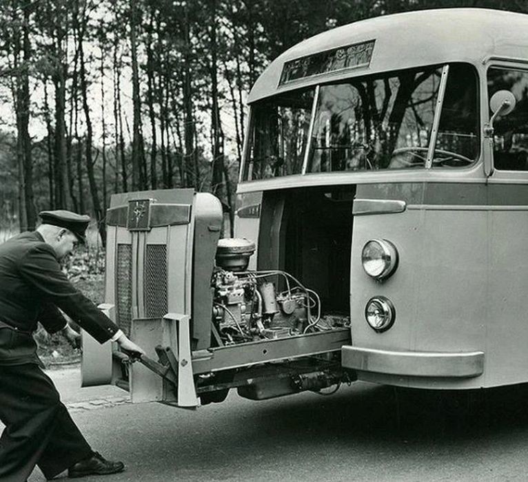 A rare example when an engineer thought about mechanics. Take a look at DAF Domburg diesel bus with retractable engine for simplicity service.