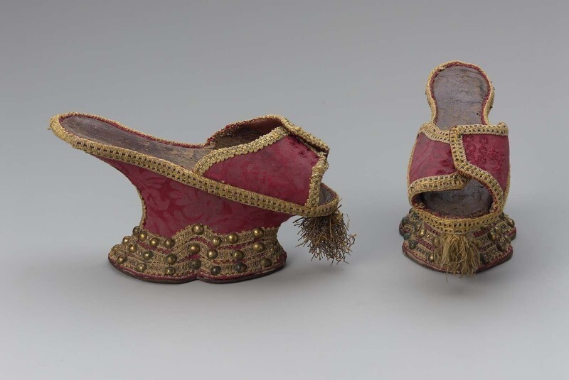 In Europe, in the 16-18 centuries, wooden "clogs" or clogs with thick soles, which were fastened with a metal hoop to the leg. Rich women wore them so as not to get dirty with street dirt.