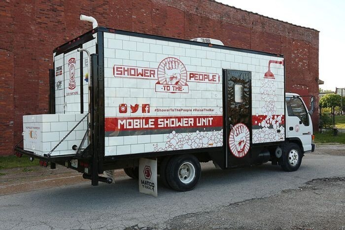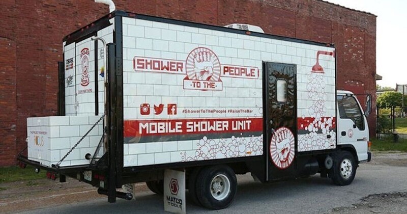 Jake bought this truck for $5,000 and turned it into mobile shower. Now he drives around St. Louis offering free shower for the homeless.