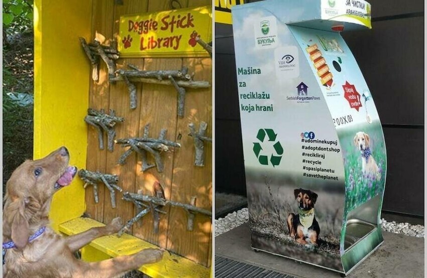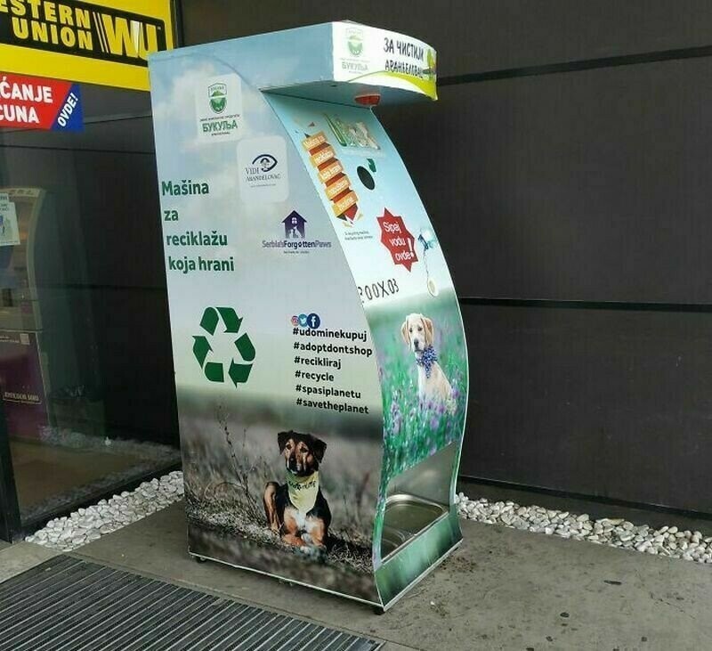 A plastic recycling machine that dispenses food to stray dogs in a Serbian city