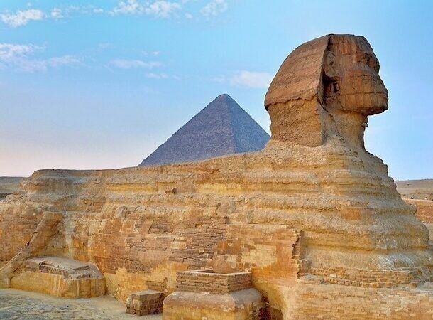 Carved from a monolithic limestone rock in the shape of a colossal sphinx - a lion lying on the sand, whose face, as has long been customary considered to be given a portrait resemblance to Pharaoh Khafre (c. 2575-2465 gg. BC BC), whose funerary pyramid is located nearby. The length of the statue is 73 meters, the height is 20 meters; between front legs there was a small shrine. Estimated date of construction - 2559 BC e.