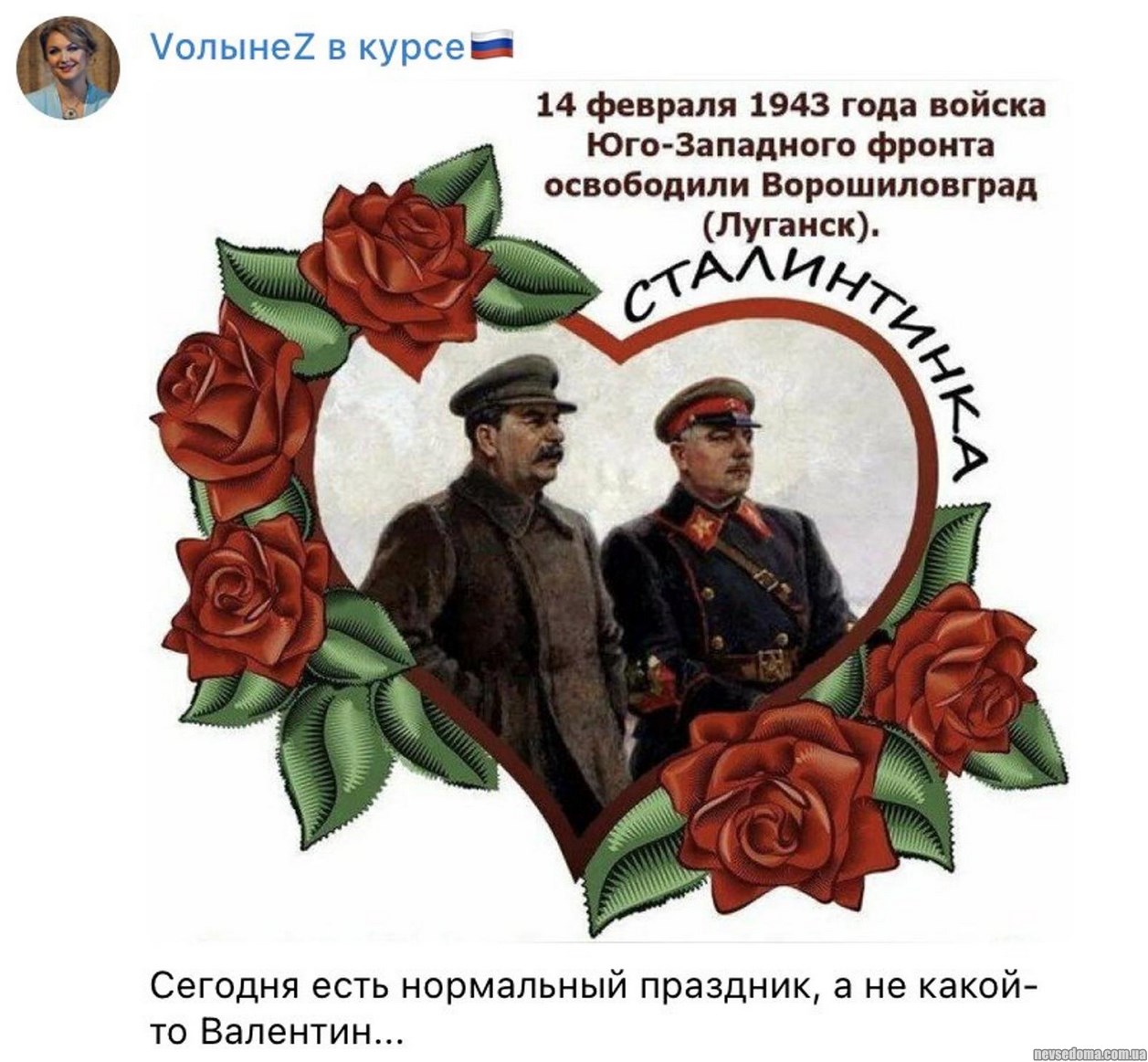 - In fascist Russia, instead of "valentines" they are now promoting "stalintinki". This is the idea of the Children's Ombudsman of Tatarstan Irina Volynets.