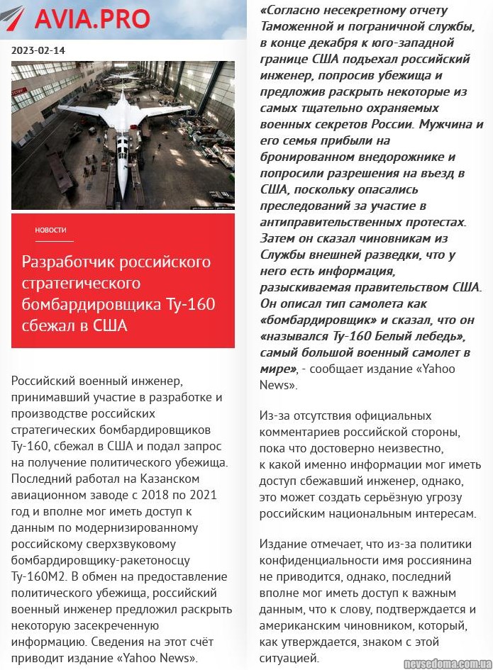 - A Russian engineer who worked on the production of Tu-160 bombers fled to the United States and is ready to share information with American intelligence in exchange for asylum