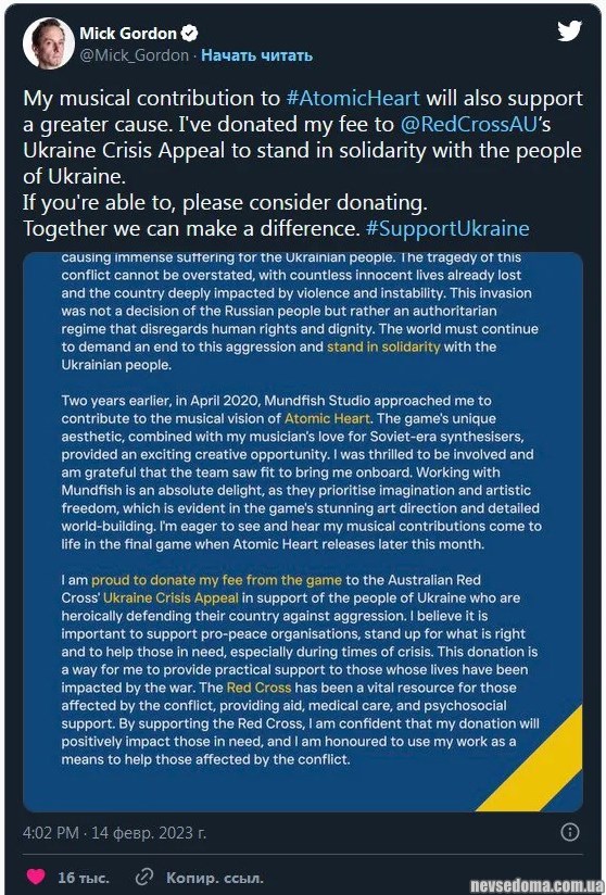 - Mick Gordon donated all the proceeds from the Atomic Heart soundtrack to help the people of Ukraine