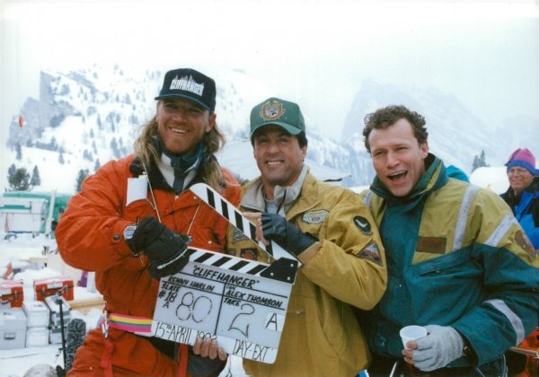 Director Renny Harlin and actors Sylvester Stallone and Michael Rooker on the set of the film "Rock Climber"