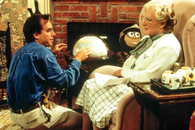 Director Chris Columbus, Robin Williams and a monkey on the set of "Mrs. Doubtfire"