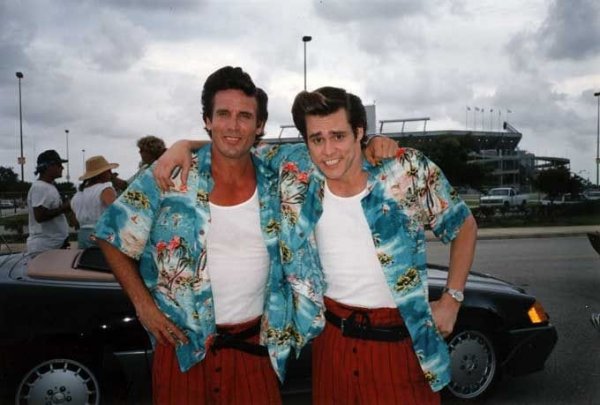 Jim Carrey and his not so mimic stunt double Tom Dickman On the set of "Ace Ventura: Pet Detective"