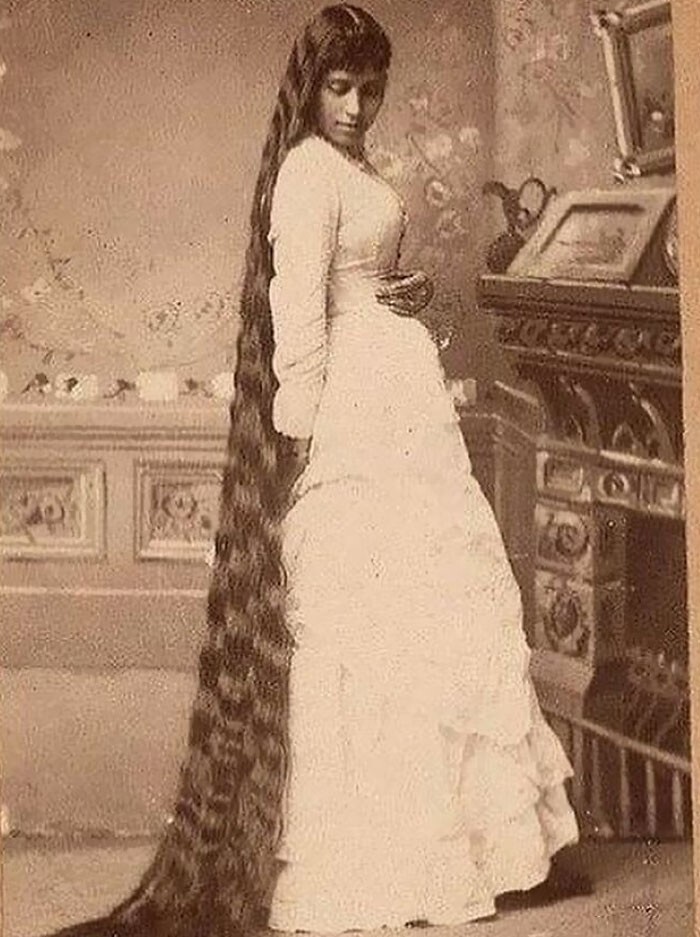 23. Victorian girl with very long hair in a fashion photo from the 1890s