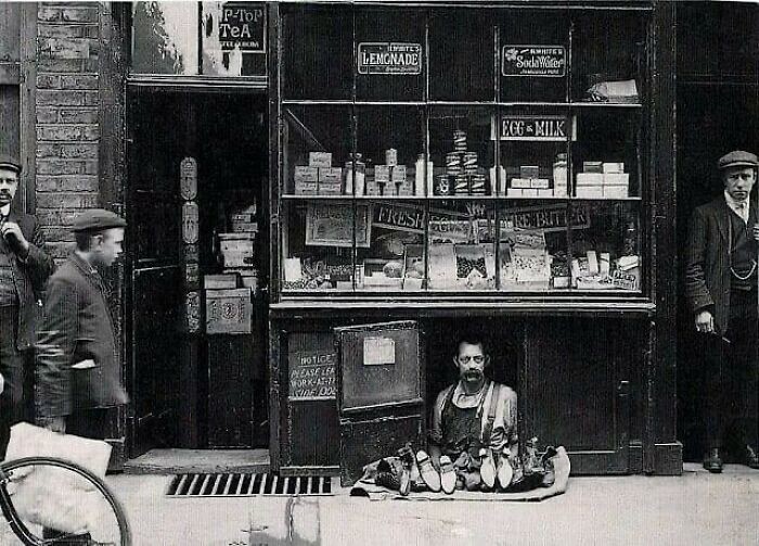 33. The smallest shop in London, occupied by a shoemaker, at 4 Bateman Street, Soho. 1910