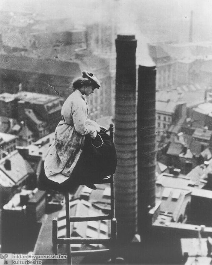 With the growth of industrialization, the number of German women working outside at home, also grew. Usually it was a job in a factory, but in some families owning their own business, the daughters also learned the craft, to help:Above we see the daughter of a master mason during the repair works on the tower of the old town hall in Berlin.