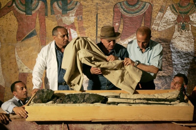 Dr. Zahi Hawass (center) monitors the movement of the mummy pharaoh Tutankhamun from his stone sarcophagus in the Valley of the Pharaohs in Luxor, November 4, 2007