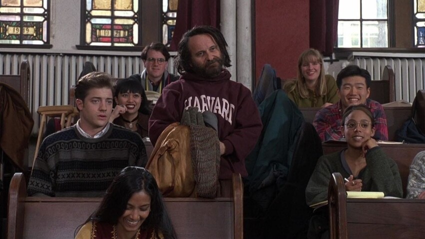 Joe Pesci as homeless Simon Wilder. suddenly becoming the holder of the thesis of the budding young lawyer Monti (performed by Brendan Fraser), he intends to return the guy an important document on a piece of paper in exchange for various benefits for themselves. So he begins to live with students and go to classes, and the unfortunate Monty and his friends are increasingly imbued with sympathy for the obsessive stranger.