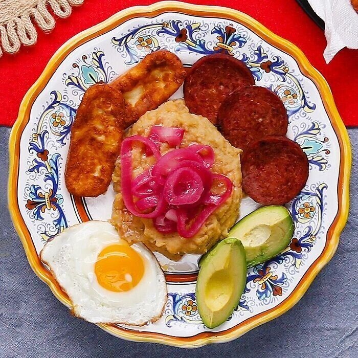 Dominican Republic, traditional breakfast "Triplet": bananas, salami, fried cheese and fried egg