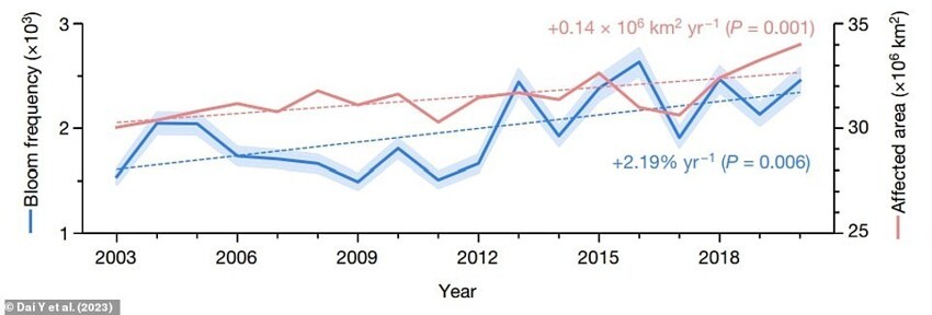 The researchers also found that over the past two decades, rising sea temperatures have increased the frequency of blooms algae, as warmer waters increase the duration flowering season.