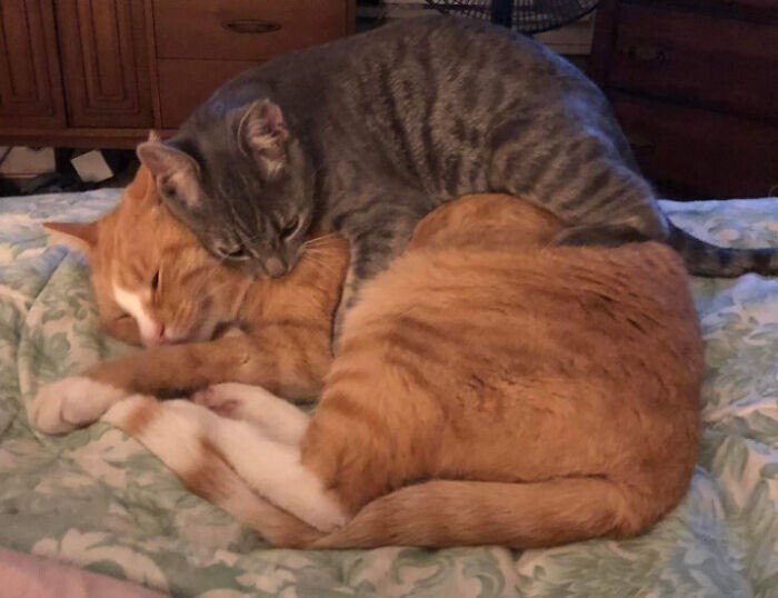 "Looks like our new shelter cat has tamed a house cat."
