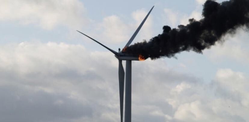 October 29, 2013. In this picture, two repairmen are embracing each other before dying after a wind turbine caught fire, where they worked in Ooltgensplaat, Holland. When the fire started two of the four older workers jumped over the fire and escaped, but young guys who were only 19 and 21 years old were afraid to do this. By the time they were sure the others had gotten out, it was already too late. One of the guys rushed down, and the other died in the fire.