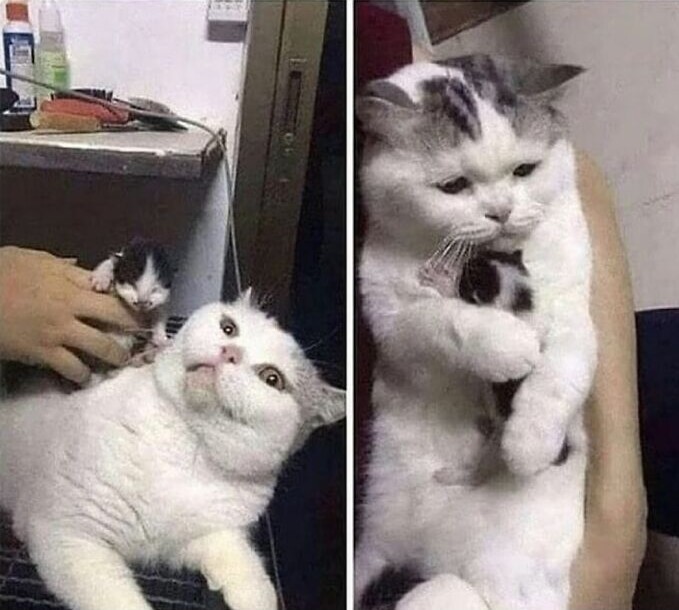 The rescued cat was recently spayed. But that's how she despite this, she reacted to a small orphan kitten from the street