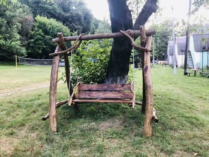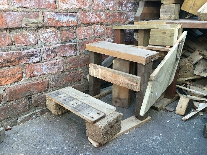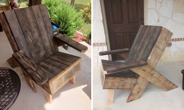 "An armchair made of boards from an old veranda"