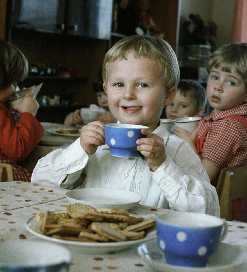 A pupil of the kindergarten of the collective farm. Lenina has an afternoon snack in the dining room, 1982