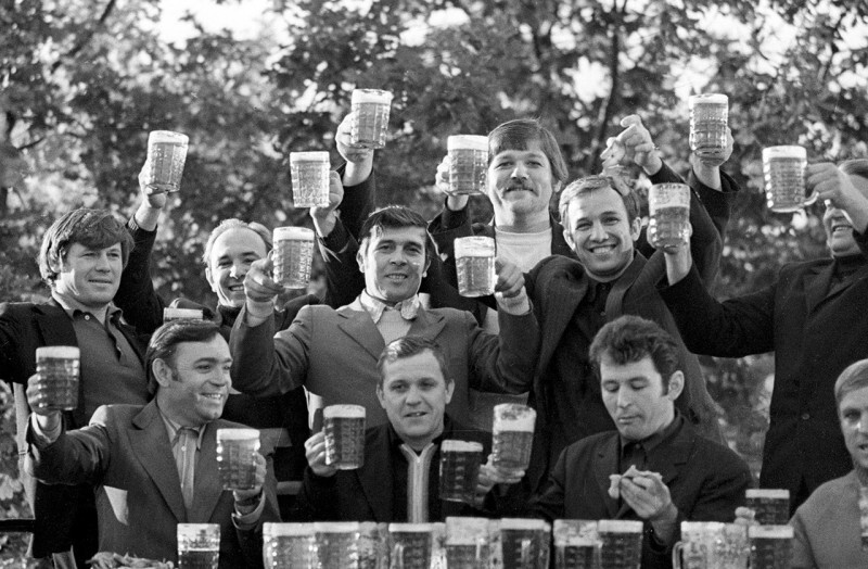 A team of miners drink beer while relaxing. Donetsk region, Ukrainian SSR. 07/01/1977