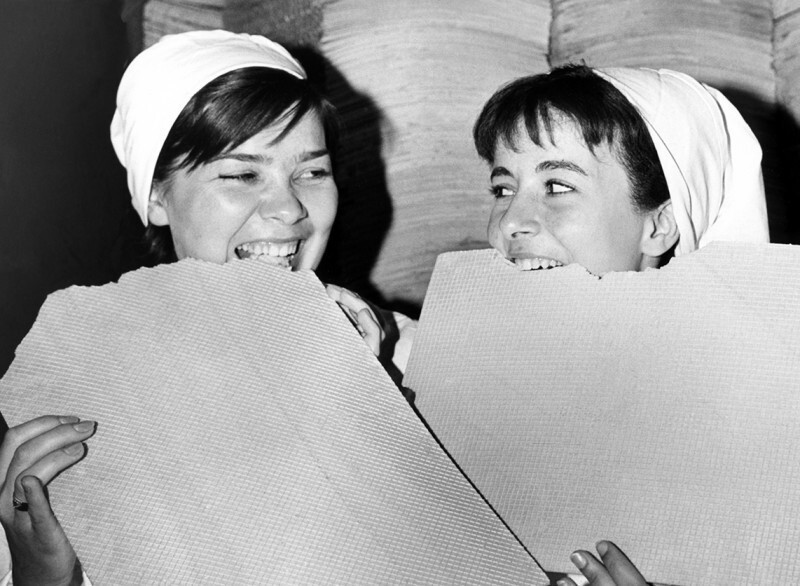 Soviet film actress Larisa Golubkina and Algerian film actress Samia Denden tasting waffles at the Rot Front confectionery factory, 1965 year