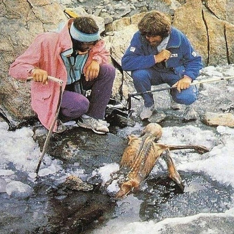 In the photo, the newly found mummy of the ice man Ötzi (1991) at an altitude of 3200m. As we now know, the body lay on ice 5300 years (copper age).