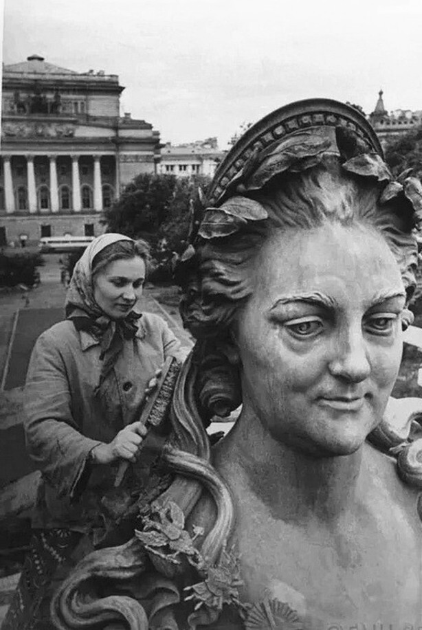 Catherine II. Leningrad, 1959. Restorer L. Kochetkova cleans the monument to Catherine the Great in Ostrovsky Park