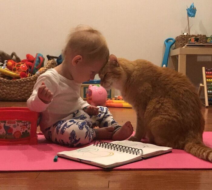 2. "Touching scene this morning with my 18 month old son and 14 year old cat"