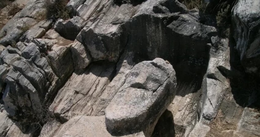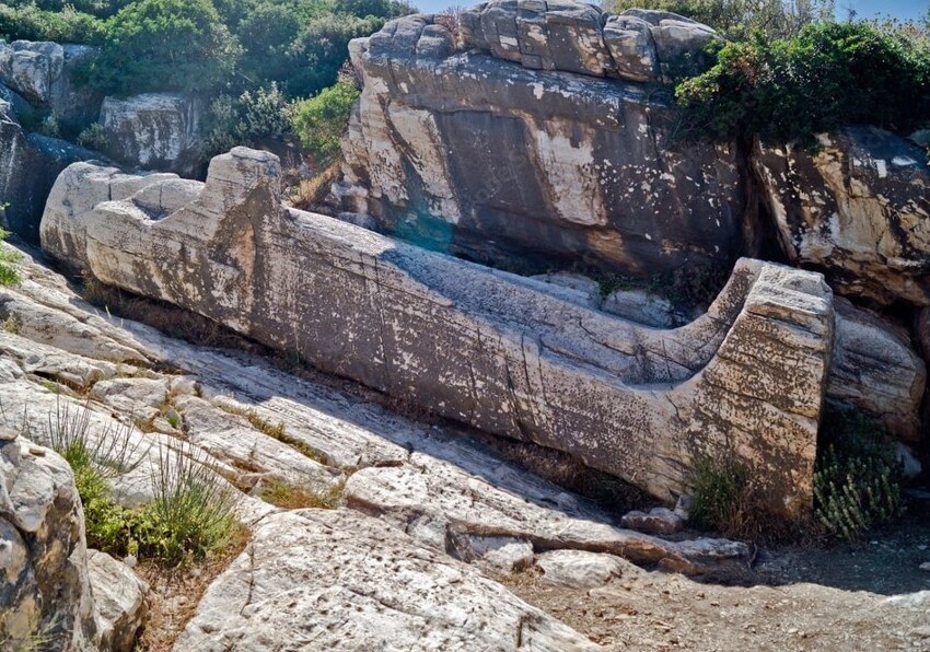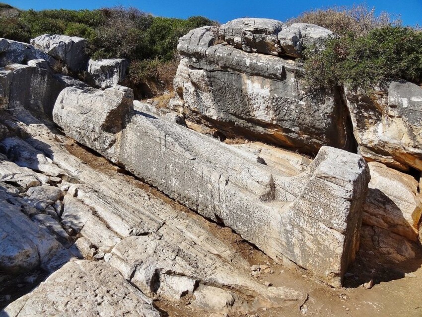 On the slope of the former quarry, a huge unfinished 11-meter statue of Dionysus. Here you can also see numerous fragments of other unfinished statues, tools for sculptures, traces of incisors and indented surfaces.