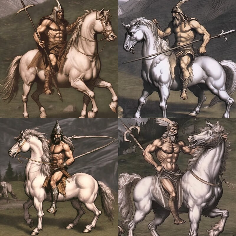 Next, it was the turn of the Bastion creatures. It's a pity that the centaurs did not want to succeed. Midjorney persistently drew a man on horse. A direct reference to the images of centaurs was not successful.