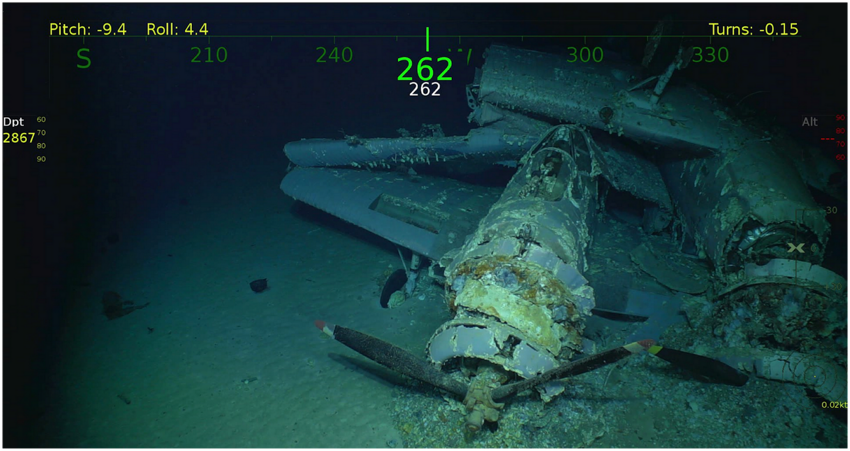The remains of Douglas TBD-1 aircraft on the aircraft carrier Lexington in the Coral Sea.