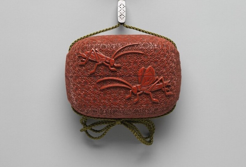 Flattened inro featuring crickets. Wood, carving, red lacquer. 19th century.