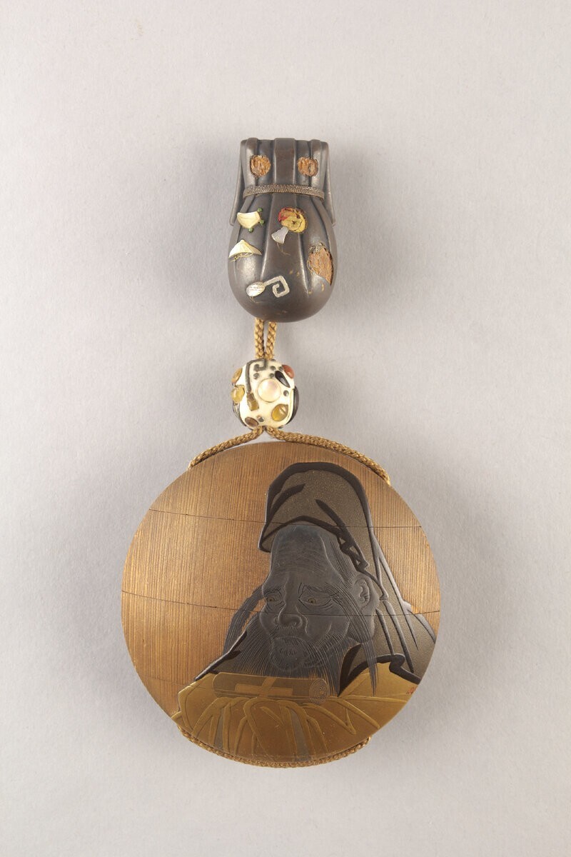 Round inro with the image of a man. Polished wood, elements of gilding, silvering. 19th century.