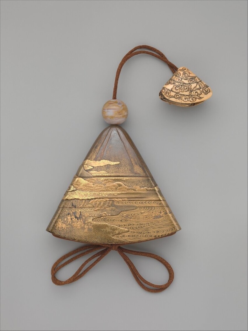 Inro in the shape of Mount Fuji, depicting a crossing and a procession. Wood, gilding, gold leaf, lacquer. Late 18th - early 19th century.