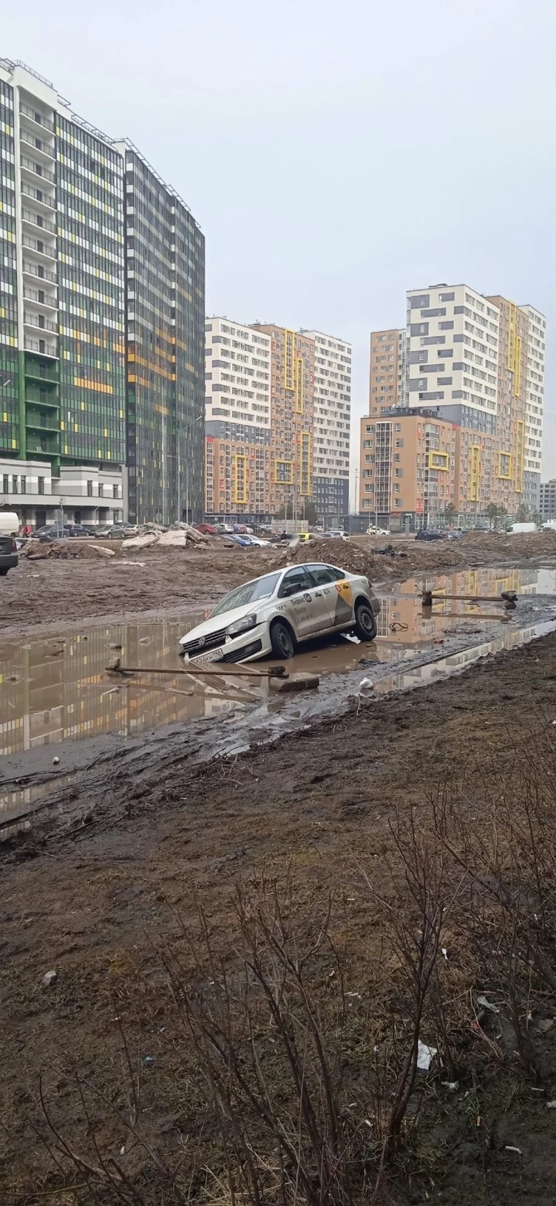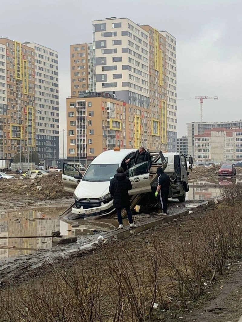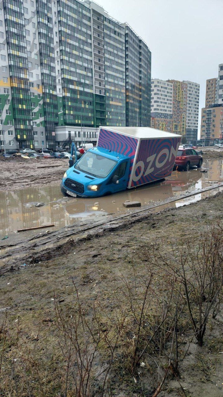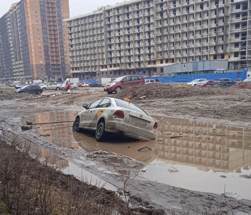In the spring, along with the snow, the roads also disappeared. This incident was captured in a residential area of St. Petersburg - Murino.