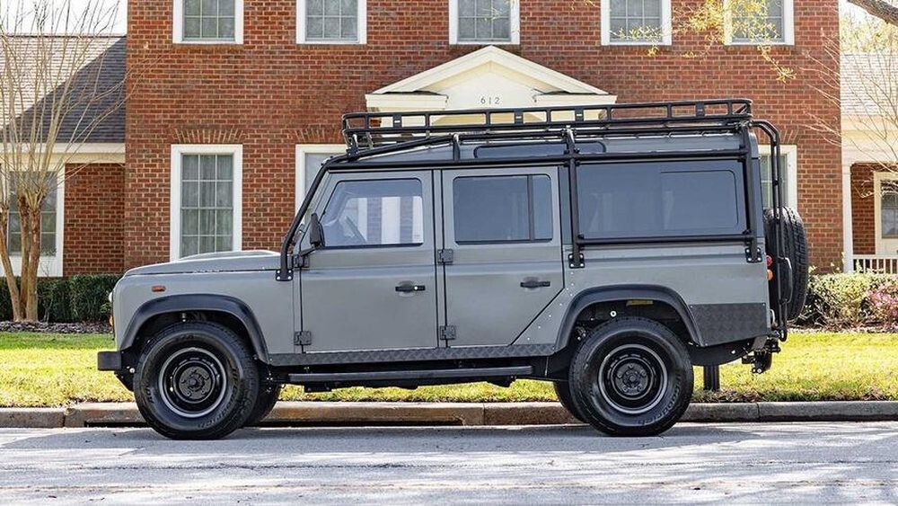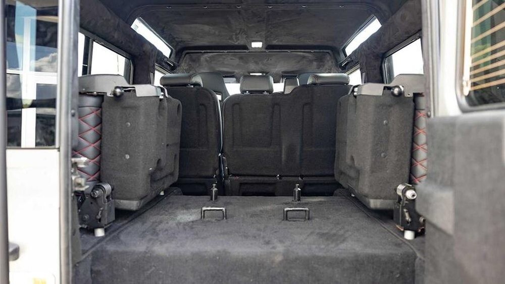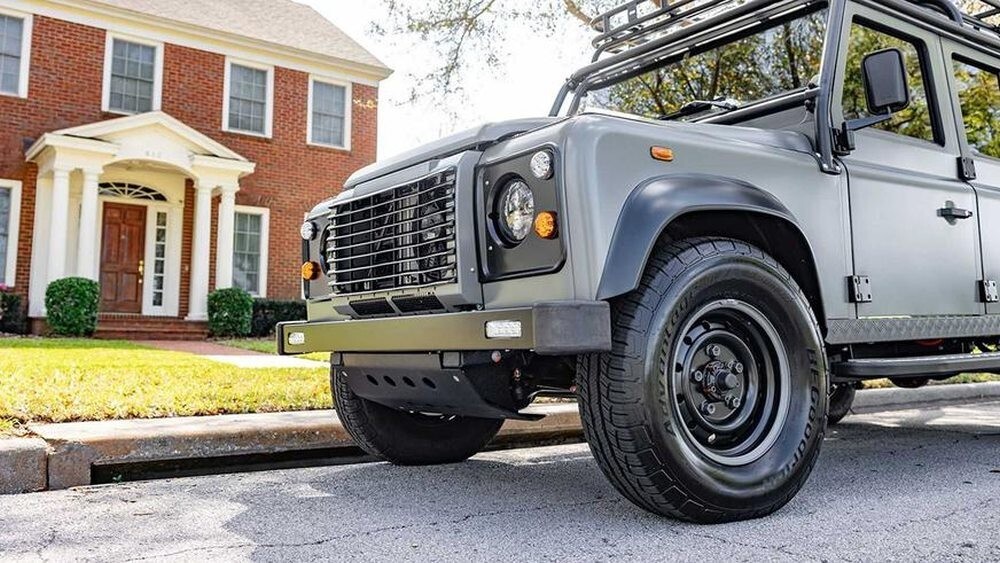The Defender body was completely restored, repainted in matte gray color and provided with an external roll cage. Also the SUV received a new grille and underbody protection. In running parts used pneumatic elements and powerful brakes.