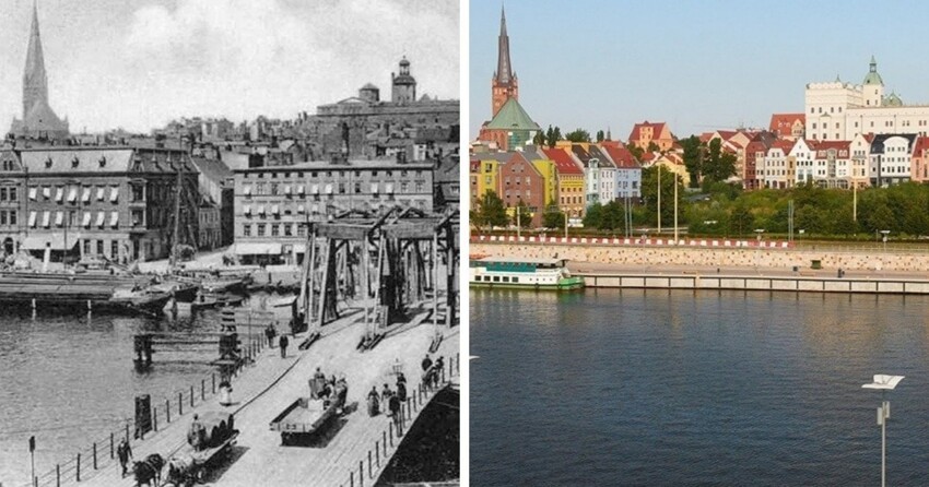 10. The Odra River in Szczecin, Poland, and a now-defunct wooden bridge - 1900 and now