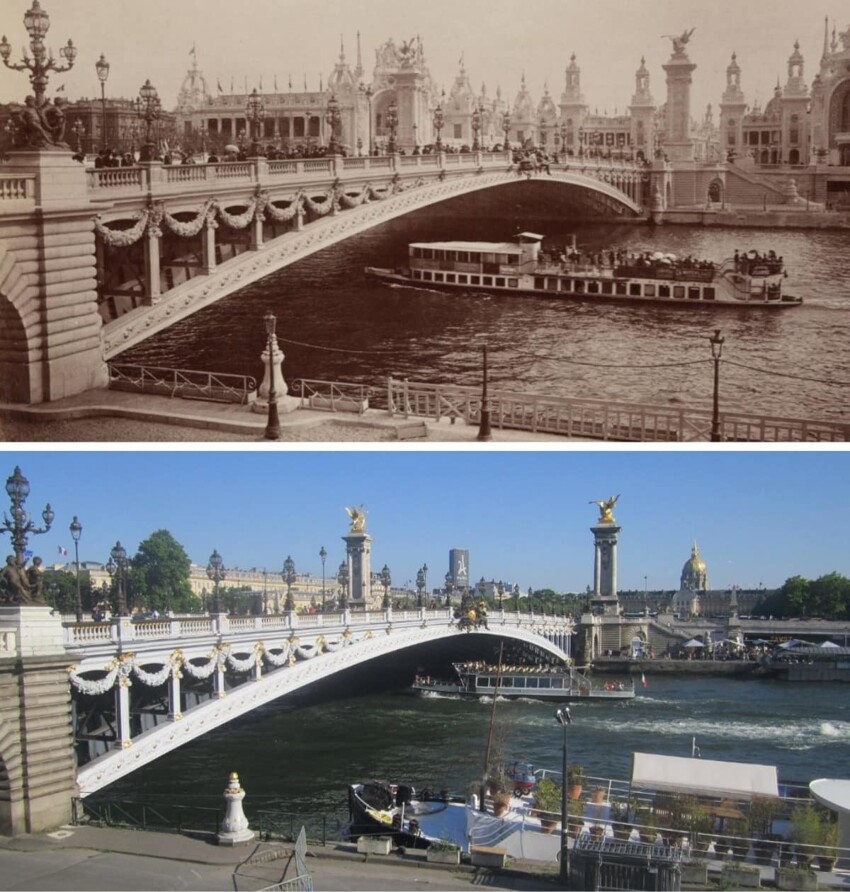7. Pont Alexandre III with the Esplanade of the Invalids from the World Exhibition in Paris in 1900 and a modern photo