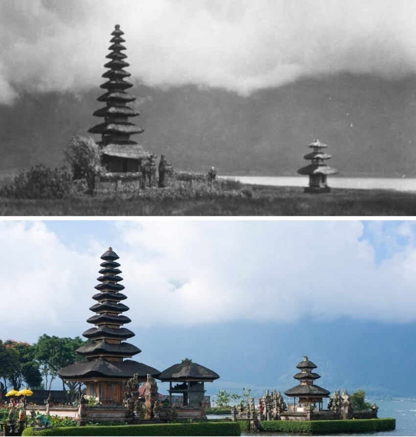 11. Hindu temple Ulun Danu on the shore of Lake Bratan, Indonesia - 1933 and now