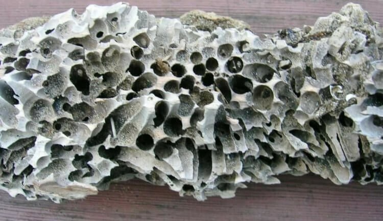 Holes in wood left by shipworms